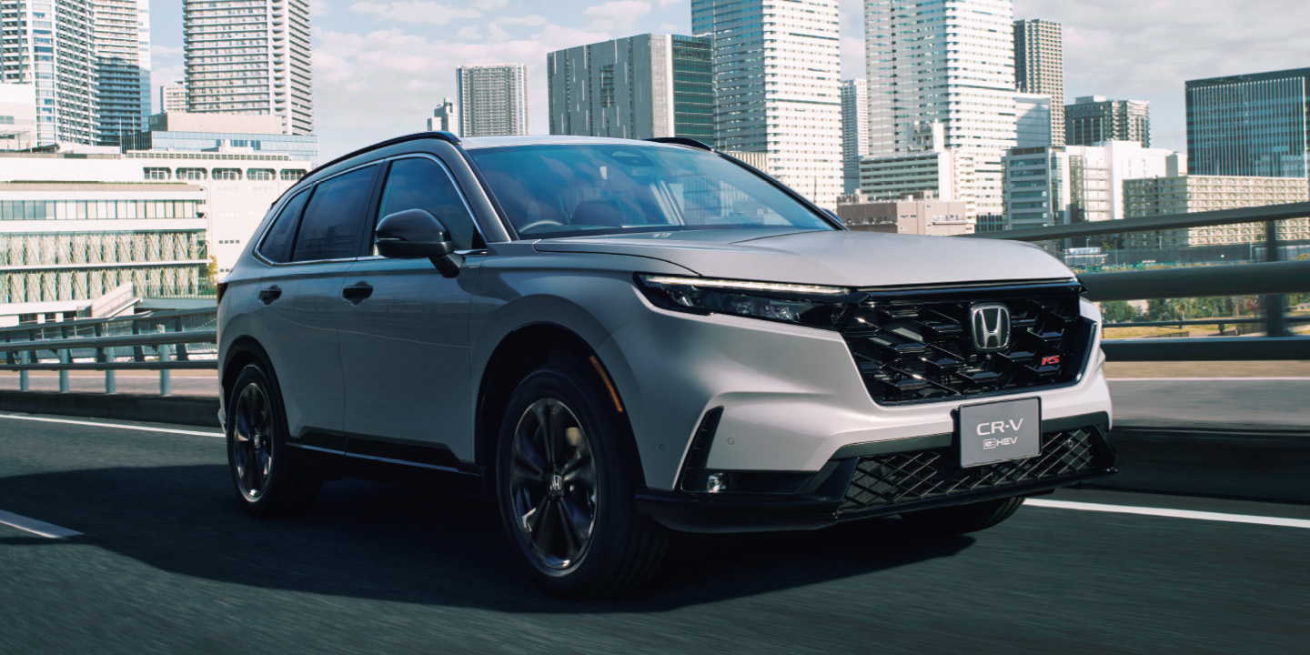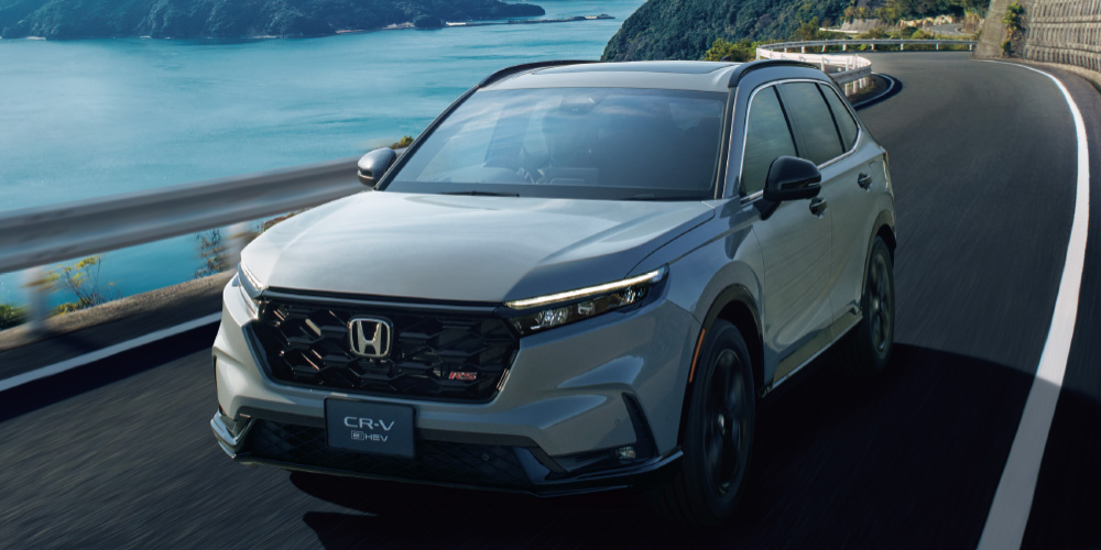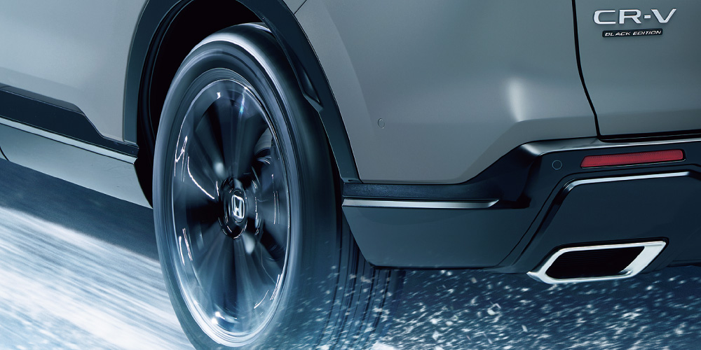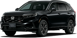 <右>CR-V e:HEV RS BLACK EDITION 車両本体価格(消費税10%込み)5,779,400円★ 価格には写真の有料色の価格は含まれておりません。 ボディーカラーはスレートグレー・パール(有料色:44,000円高) ■写真は合成です。雪道の走行時にはチェーンまたは冬用タイヤを装着してください。安全に配慮した運転にご留意ください。