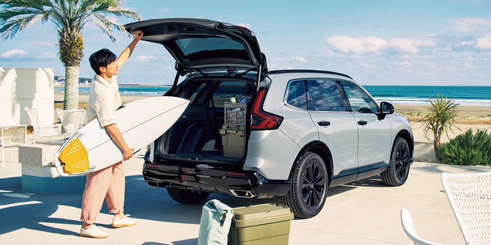 <中央>CR-V e:HEV RS BLACK EDITION 車両本体価格(消費税10%込み)5,779,400円★ 価格には写真の有料色の価格は含まれておりません。 ボディーカラーはスレートグレー・パール(有料色:44,000円高) ■小物類は撮影のために用意したものです。■小物類の形状、サイズ等によっては積めない場合があります。■シートアレンジの各操作は、異物をはさんでいないか確認の上、無理な力をかけず確実に行ってください。■安全のため走行の際は荷物をしっかりと固定してください。